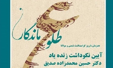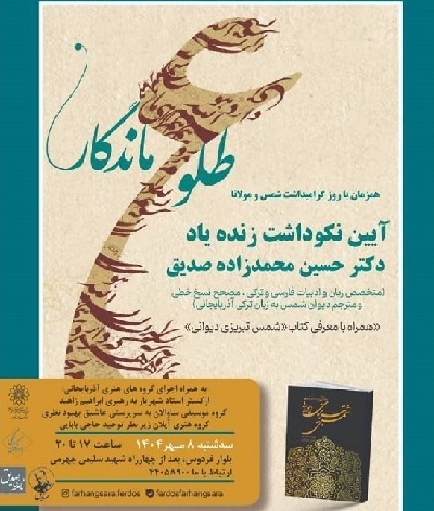همزمان با روز گرامیداشت شمس و مولانا آیین نکوداشت زندهیاد حسین محمدزاده صدیق، متخصص زبان و ادبیات فارسی و ترکی، مصحح نسخ خطی و مترجم دیوان شمس به زبان ترکی آذربایجانی با میزبانی فرهنگسرای فردوس برپا میشود. در این آیین که با معرفی کتاب «شمس تبریزی دیوانی» همراه خواهد بود ارکستر استاد شهریار به رهبری ابراهیم زاهید، گروه موسیقی ساوالان به سرپرستی عاشیق بهبود نظری و گروه هنری آیلان زیرنظر توحید حاجیبابایی به اجرای برنامه میپردازند.