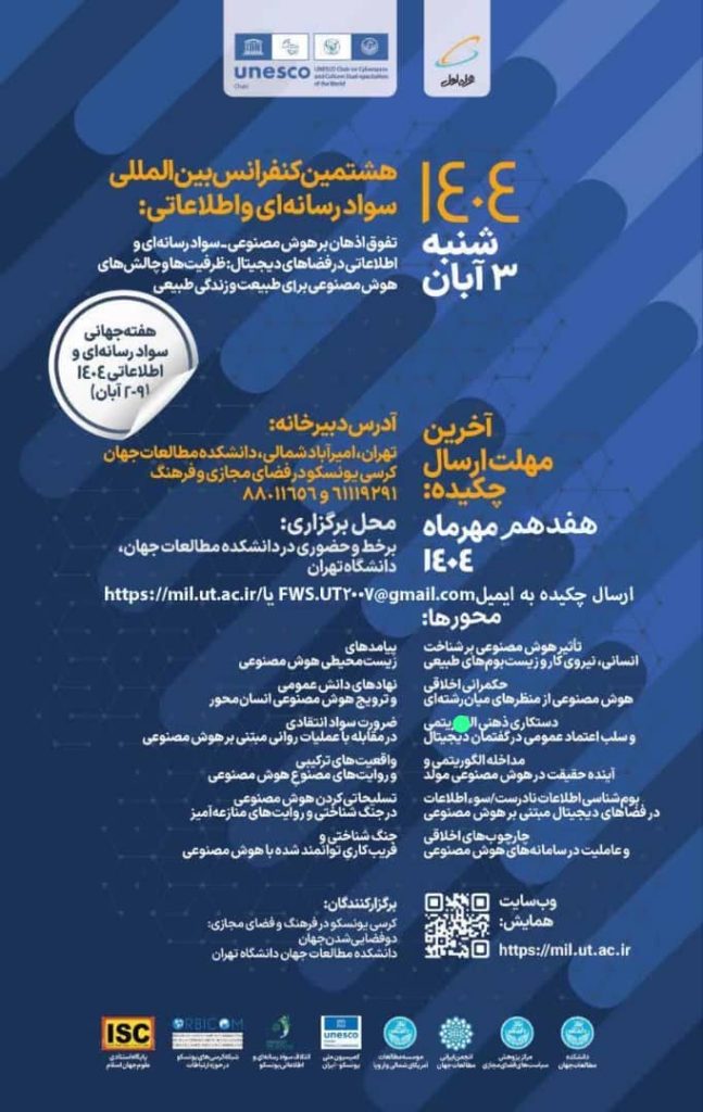 در آستانه هفته جهانی سواد رسانهای و اطلاعاتی، کرسی یونسکو در فضای مجازی و فرهنگ، هشتمین کنفرانس بینالمللی سواد رسانهای و اطلاعاتی را با محوریت «تفوق اذهان بر هوش مصنوعی» برگزار میکند.