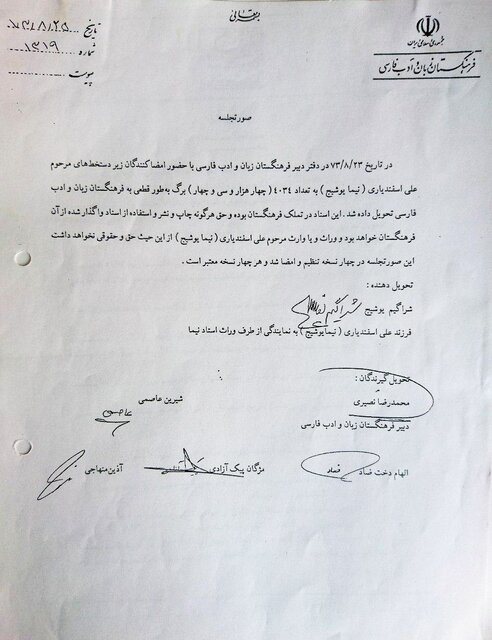 لازم است اشاره کنم که در سال ۱۳۷۲ من برای انتقال کالبد پدرم به یوش و شرکت در مراسم بزرگداشت نیما توسط سازمان جهانی یونسکو به ایران آمدم. همان زمان این بحث مطرح شد که من برخی اقلامِ باقیمانده از نیما را برای تأسیسِ موزهی یوش به میراث فرهنگی بسپارم. از اینرو، تصمیم گرفتم برخی از دستنوشتههایی که آسیبدیده بودند، به اضافهی مُسوّدههای مغشوش و اتود اشعاری را که اغلب امکان استنساخ نداشتند، برای حفاظت و نگهداری به میراث فرهنگی بسپارم. با این وعده که قرار بود از آنها میکروفیلم تهیه شود. در نهایت این روند به تأسیس موزهی یوش، تحویل برخی اموال و برخی دستنوشتهها در سال ۱۳۷۳ ختم شد. این همان مجموعهیی است که بعدتر طی هماهنگیهای داخلی بین دو نهاد، به فرهنگستان زبان انتقال یافت و تهمت فروش آثار پدرم از جانب من را در پی داشت!